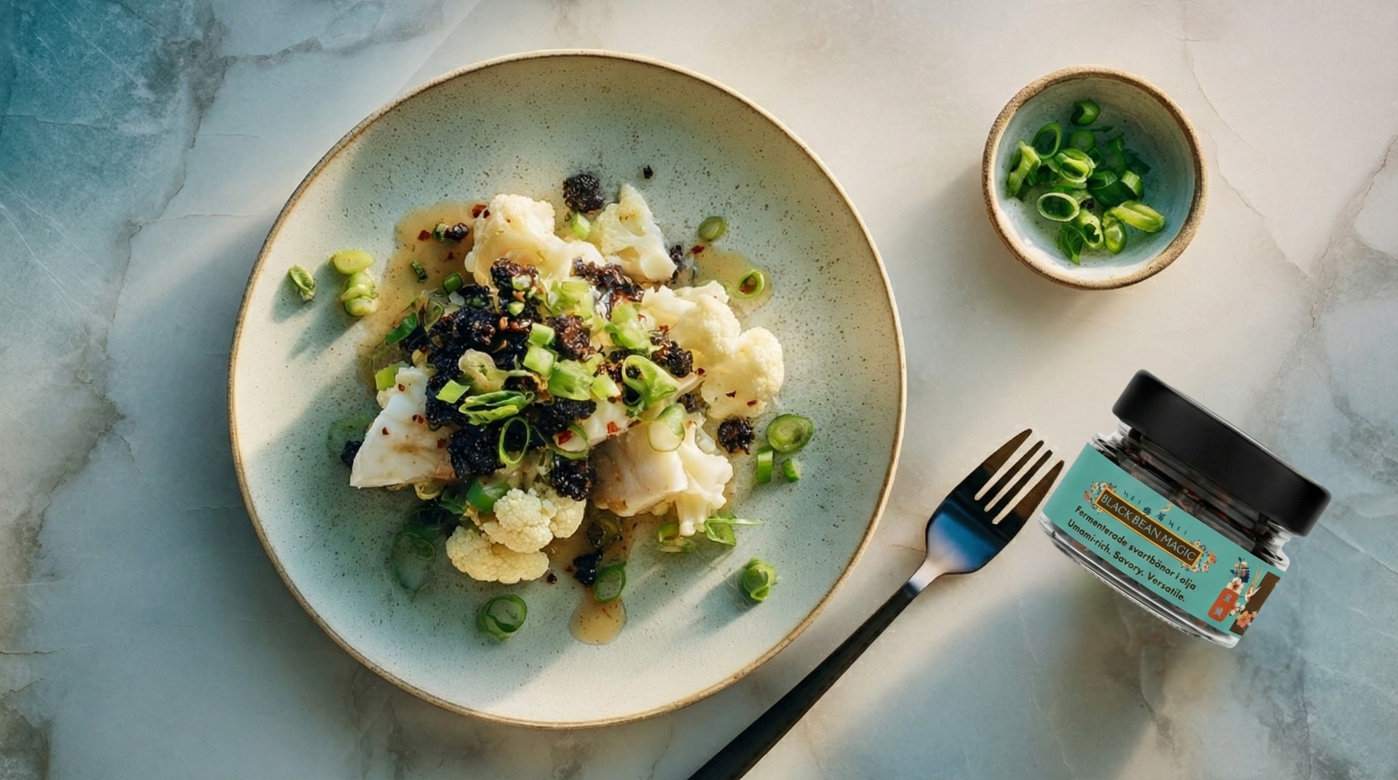 - Skeda över den aromatiska svartbönssåsen och ringla gärna några droppar MeiMei Chiliolja för extra djup och sting.